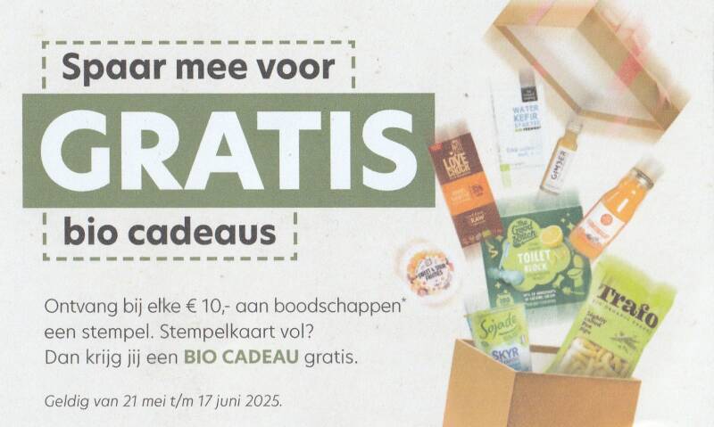 In de periode van 21 mei t/m 17 juni 2025 ontvang je bij elke 10 euro aan boodschappen een bio cadeaustempel. Bij inlevering van een spaarkaart met 5 stempels kun je een gratis Bio Cadeau uitzoeken. Bij 10 stempels een Bio Top Cadeau